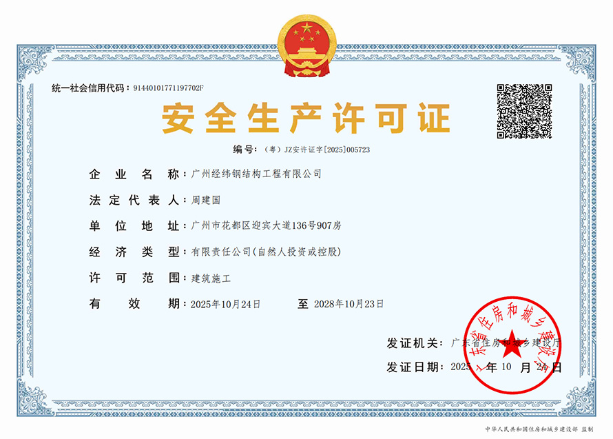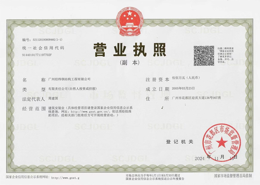 廣州經緯鋼結構工程有限公司是一家專注于鋼結構的施工安裝、服務的專業鋼結構工程公司。公司具有國家鋼結構專業承包二級資質,承接各種形式的鋼結構及網架工程。 公司于2005年成立,位于廣東省廣州市花都區。